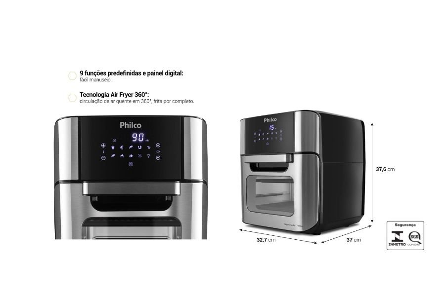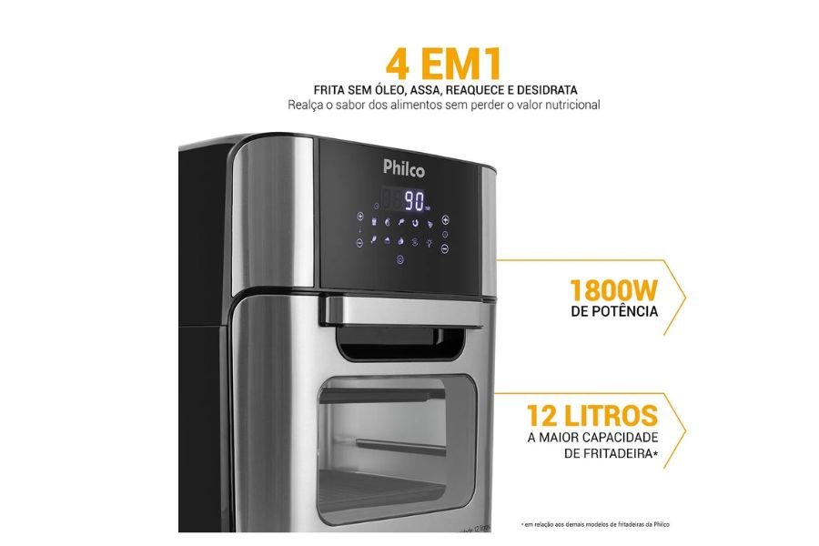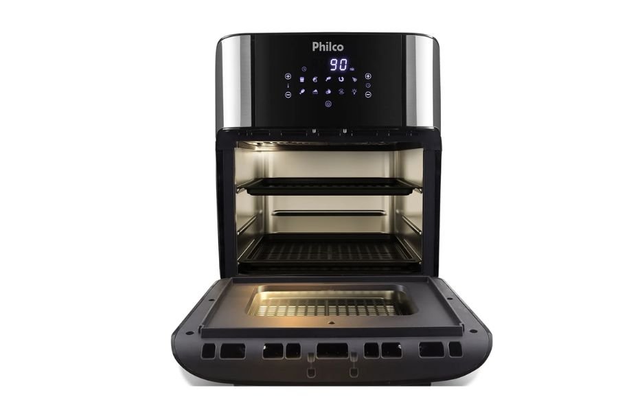 Além da capacidade de 12 litros, a Philco PFR2200 chama atenção pelas funções extras que vão além de uma air fryer comum.